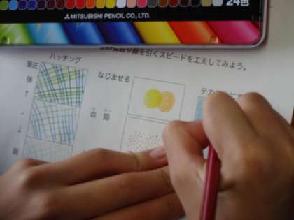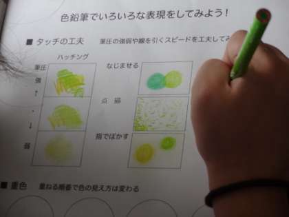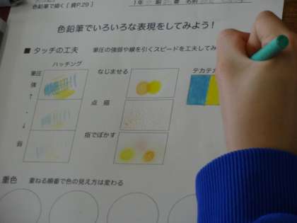 1年2組、美術。「色鉛筆で描く いろいろな表現をしてみよう!」