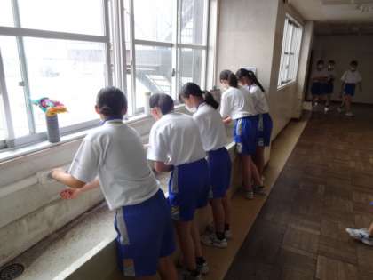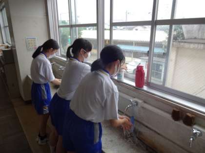 2年3・4組、体育女子。授業が終わり教室に戻る前に、必ず「手洗い」です。