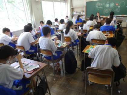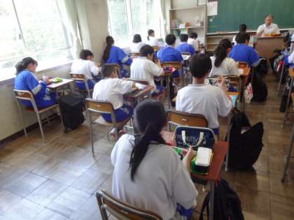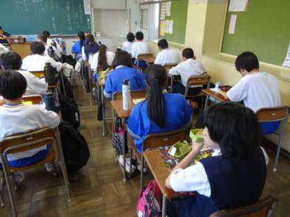 昨日から始まった昼食の様子です。みんな前を向いて、机は離し、出来るだけ会話はせずに……。今は我慢です。ランチョンマット使っていますね。1年生。