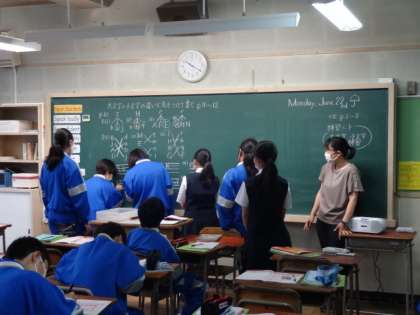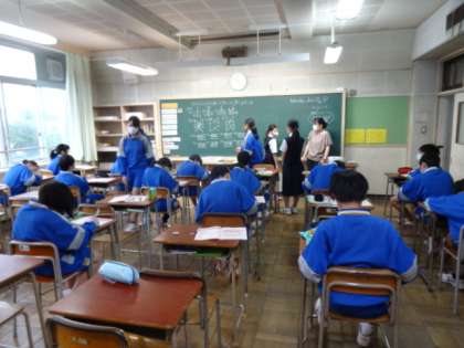 1年1・2組、英語。「大文字と小文字の違いに気をつけて書く」