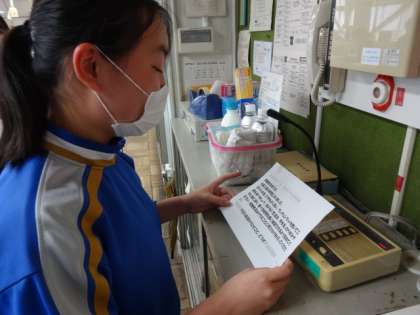 昼食時間に合わせて、保健委員会の放送です。「手洗い、うがい、ランチョンマット」