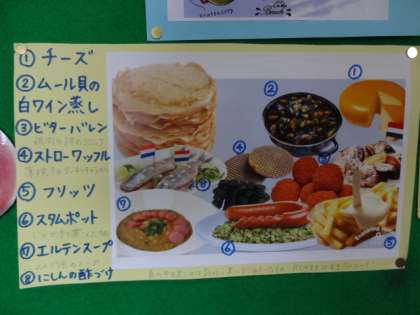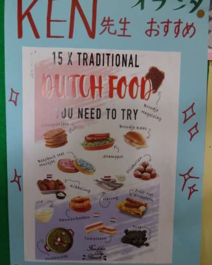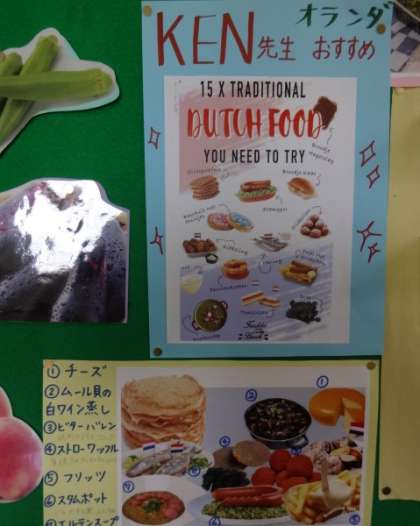 今月の食育掲示板は「世界各国の料理をのぞいてみよう」ALTケン先生大活躍!