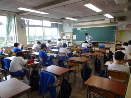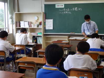 明日から今年度初の定期考査です。今日の授業風景です。1年3組、体育男子。「心と体は互いに影響し合うことを知る」