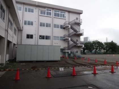 南校舎のトイレ改修工事が8月から始まります。1年生は、工事期間仮設トイレを使用することになります。昨日、仮設トイレの外側が設置されました。改修工事は、工事業者と連携して、生徒の安全に十分配慮して行うようにしていきます。