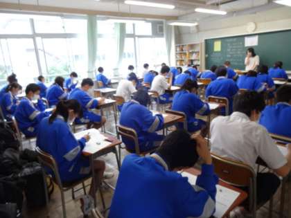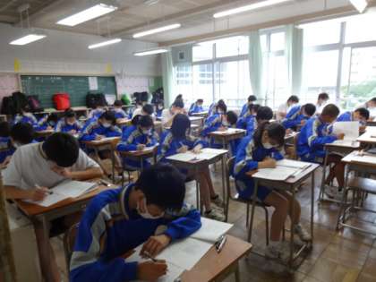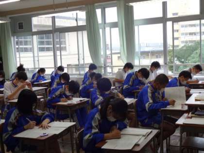 今日は期末考査3日目、最終日です。みんな頑張っています。3年2組。