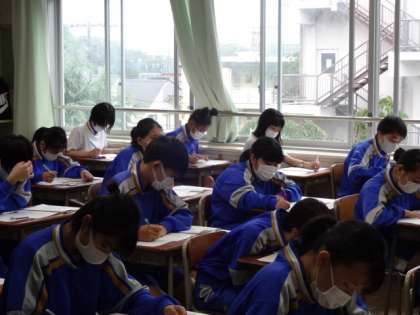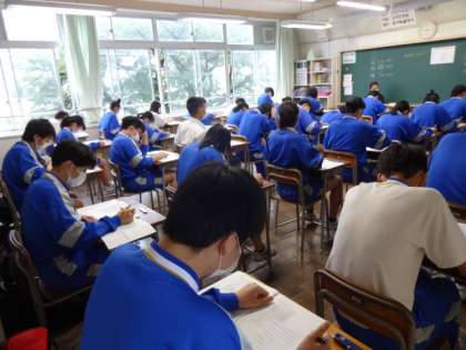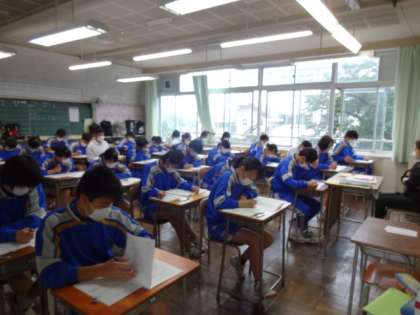 今日は期末考査3日目、最終日です。みんな頑張っています。3年4組。