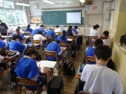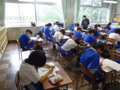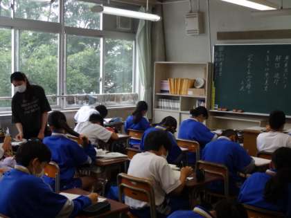 1年1組、国語。テスト返却・解説。間違えたところをしっかり復習!