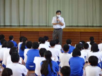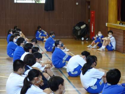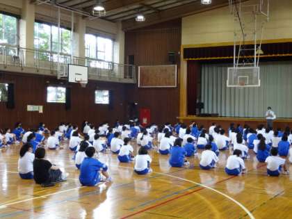 今日は1学期の最終日です。それぞれの学年が、まとめの学年集会を開いています。1年生。