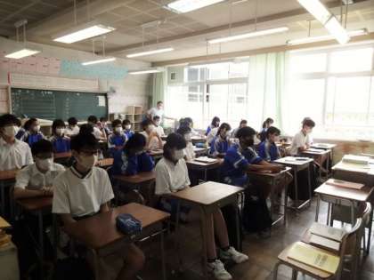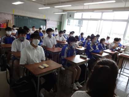 今日から2学期が始まりました。始業式は、感染症対策として放送で行いました。3年生の様子です。