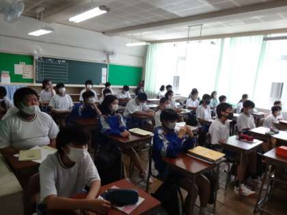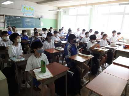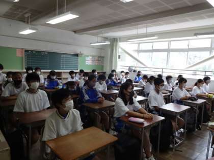 今日から2学期が始まりました。始業式は、感染症対策として放送で行いました。1年生の様子です。南校舎のトイレ改修工事のために、しばらくの間中央校舎の3階・4階に分かれて生活します。