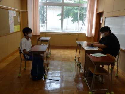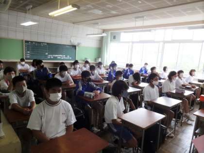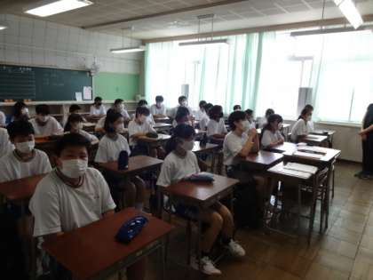 今日から2学期が始まりました。始業式は、感染症対策として放送で行いました。1年生の様子です。1組から5組は、南校舎のトイレ改修工事のために、しばらくの間中央校舎の3階・4階に分かれて生活します。