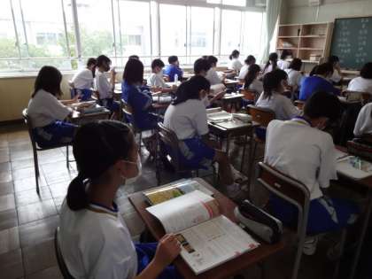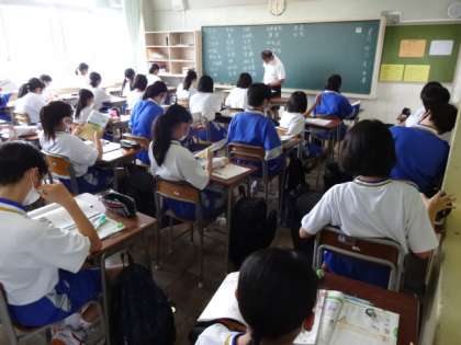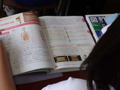 1年4・5組、体育女子。保健の授業です。「体の発育・発達」