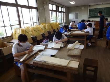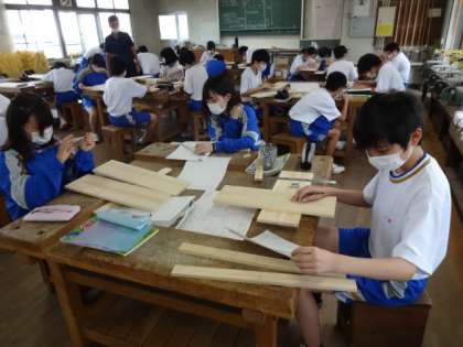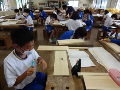1年5組、技術。ミラクルラックのけがき(罫書き)作業中です。