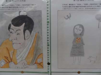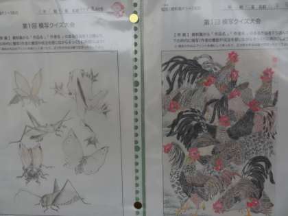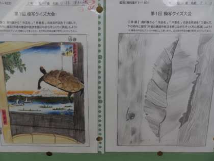 職員室前に掲示してある1学期に行った「模写クイズ大会」の優秀作品です。「資料集から作品を1つ選んで模写(作者の意図や技法を感じながらそっくりに再現)しよう」