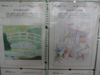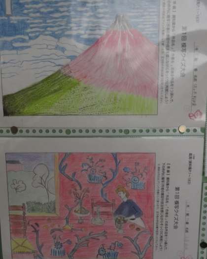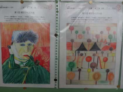 職員室前に掲示してある1学期に行った「模写クイズ大会」の優秀作品です。「資料集から作品を1つ選んで模写(作者の意図や技法を感じながらそっくりに再現)しよう」
