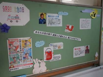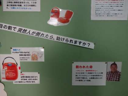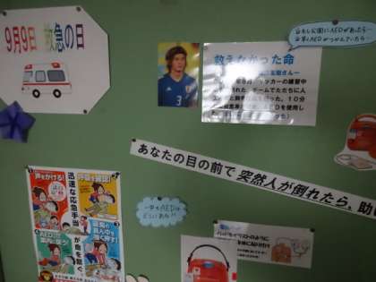 保健室前の掲示です。一中のAEDがどこにありか知っていますか?