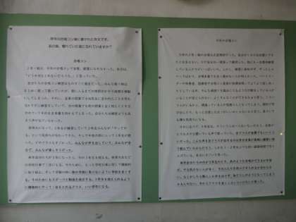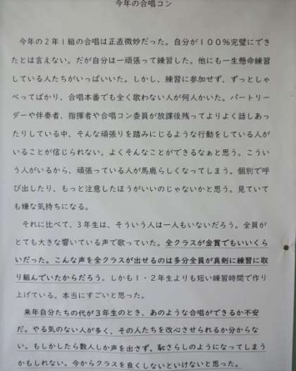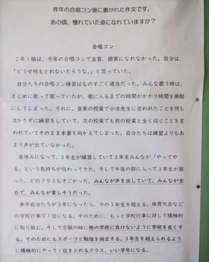 3年生の廊下に掲示されていました。現3年生が、昨年度の合唱コンクール後に書いた作文です。「あの頃、憧れていた姿になれていますか?」