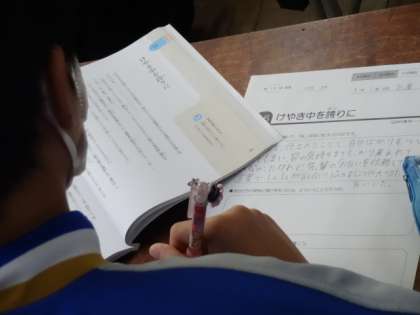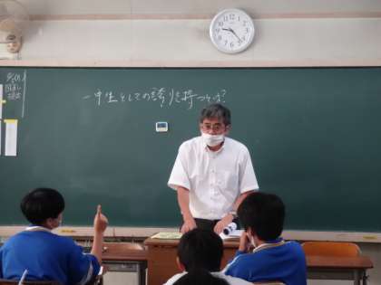 1時間目、道徳の授業風景です。1年生は「けやき中を誇りに 学校行事をとおして先輩から学びたいと思うことはどんなことがあるだろう」 1年1組。