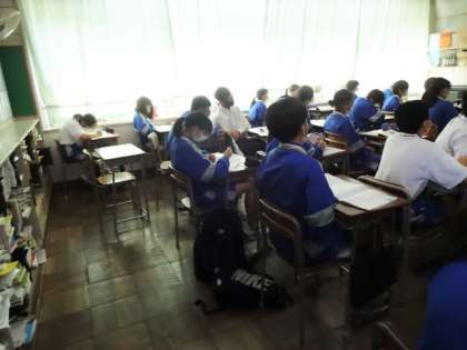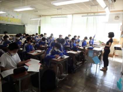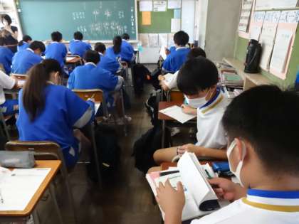 1時間目、道徳の授業風景です。2年生は「SNSとどうつき合う? SNSのよいところはどこだろう。気をつけなければいけないところはどこだろう」2年1組。