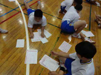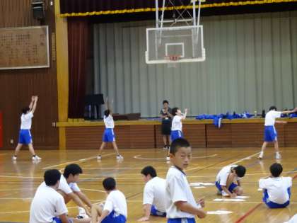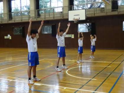 1年4・5組、体育男子。ラジオ体操のテスト中です。