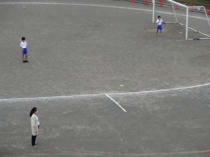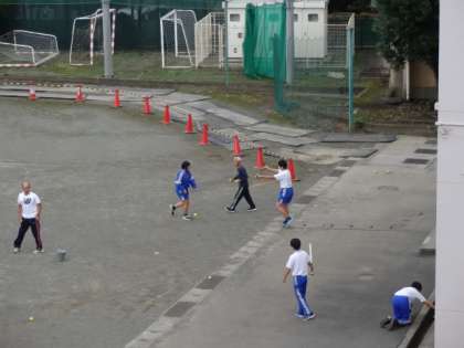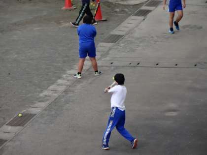 7組、体育。球技。バッティングも上手になってきました。守りも忙しい。