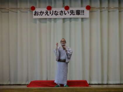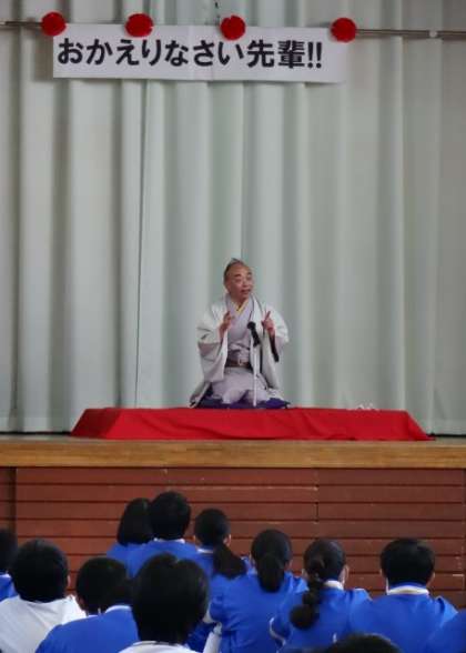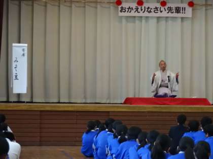 講師に一中卒業生の「林家うん平」さんを招き、「夢に向かって」という題で講演を行っていただき、最後には短い落語の「みそ豆」を話していただきました。感染症対策のために、学年ごとの講演です。ほとんどの生徒にとって、生で落語を聞くことは初めての経験だったようです。うん平さん、ありがとうございました。
