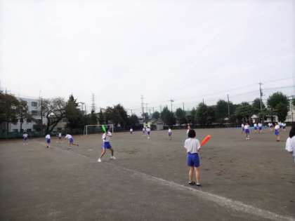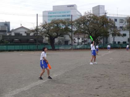 3年1・2組、体育女子。「ベースボール型球技」柔らかいビニールバットで打つ練習。