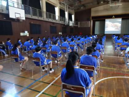 今年のセーフティ教室は、感染症拡大防止のため、1年と7組の生徒を対象に行いました。DVDで万引き等の窃盗、SNSの危険性を学びました。