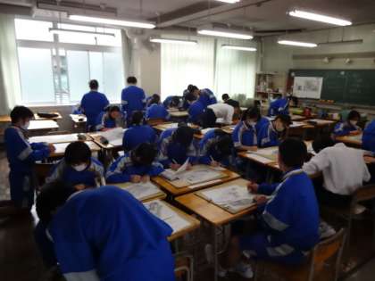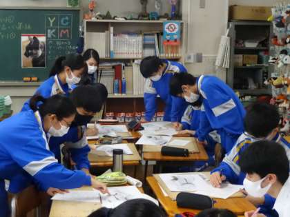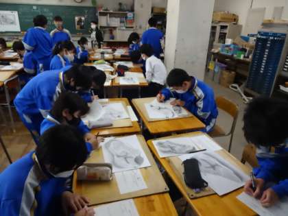 3年1組、美術。「作品鑑賞会 他の人の作品から良いアイディアを学ぼう!」