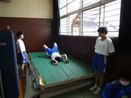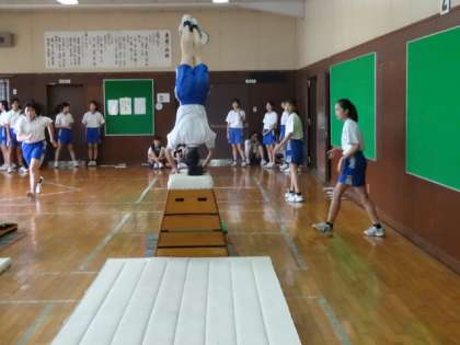 2年1・2組、体育女子。「跳び箱 自己に適した技で演技する」開脚跳び、開脚伸身跳び、かかえ込み跳び、頭はね跳びやハンドスプリング(前方倒立回転跳び)に挑戦しています。