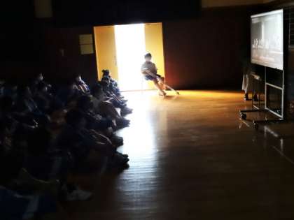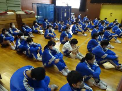 ビデオを使った立会演説会。感染症対策を考えた選挙でした。1年生は、格技室。
