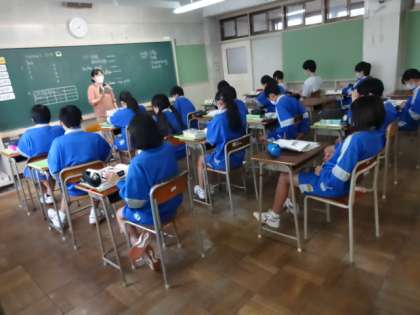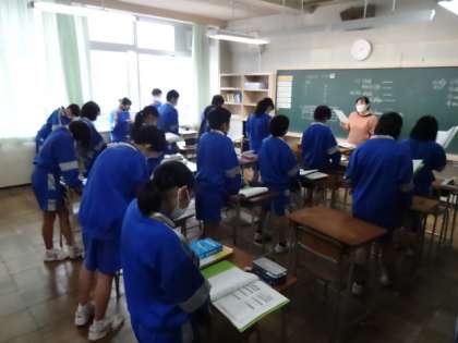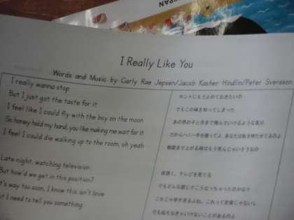 1年4・5組、英語。英語の歌(I Really Like You)を歌っていました。