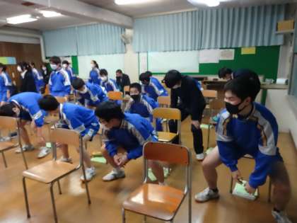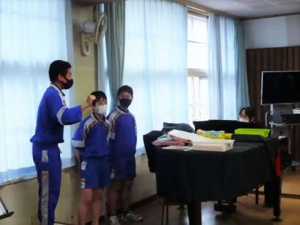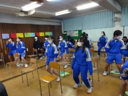3年3組、音楽。校歌を歌っていました。なぜこのような格好で歌っていたのかは謎です。