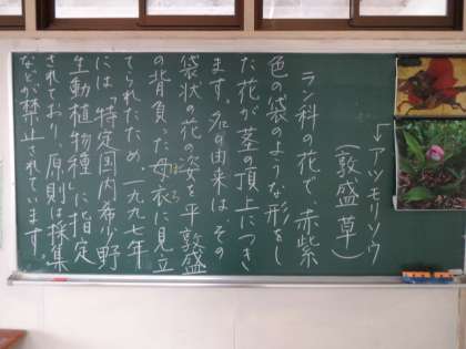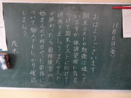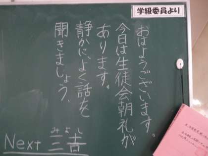 学年掲示板 今日のひとこと。今日は生徒会朝礼(1年)。体調管理に気をつけて(3年)。敦盛草(2年)。