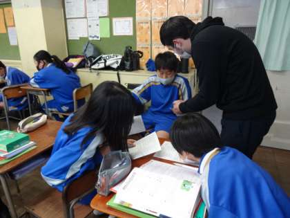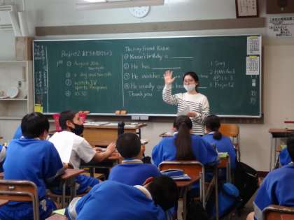 1年1組、英語。ALTのケン先生が一緒に授業をしていました。