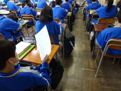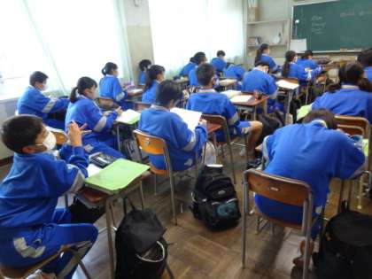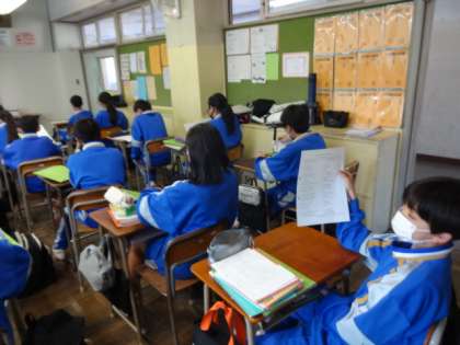 1年1組、英語。「Santa Claus is Coming to Town」の練習。