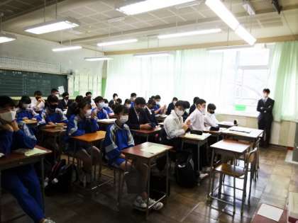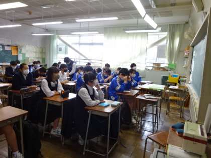 今日は11月の全校朝礼です。感染症対策のため、放送で行いました。3年生の様子です。