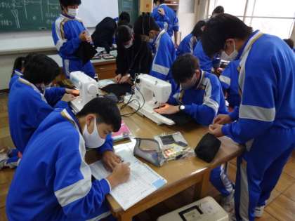 2年2組、家庭科。巾着の製作。