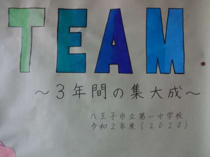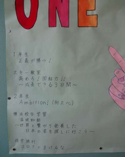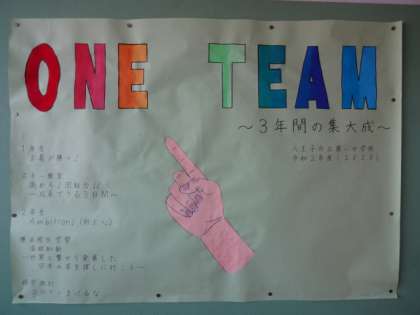 3年生の廊下に貼ってありました。今こそ ONE TEAM。