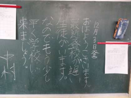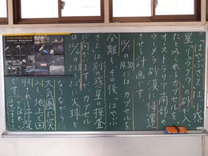 学年掲示板。体調管理を(1年)、最近登校が遅い(3年)、はやぶさ2(2年)。
