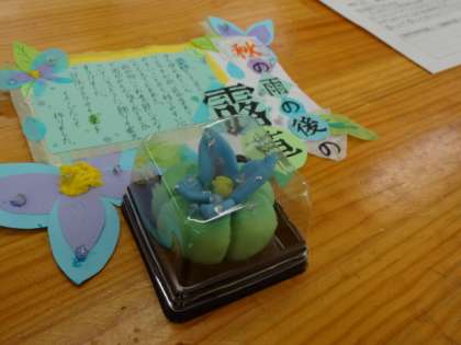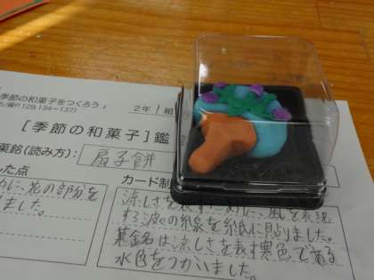 2年1組、美術。「粘土の和菓子」鑑賞会。