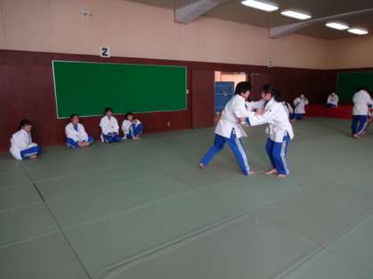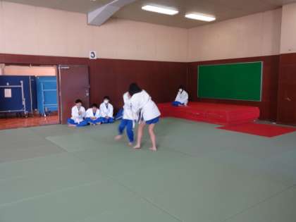 1年1・2組、体育女子。柔道。団体戦の方式で、チームから一人ずつ出て対戦します。