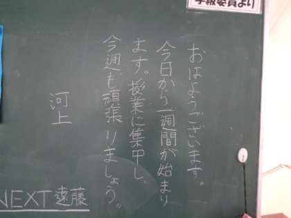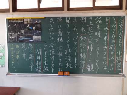 学年掲示板。一週間が始まる(1年)、あっぱれ!はやぶさ2(2年)。