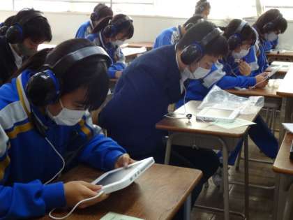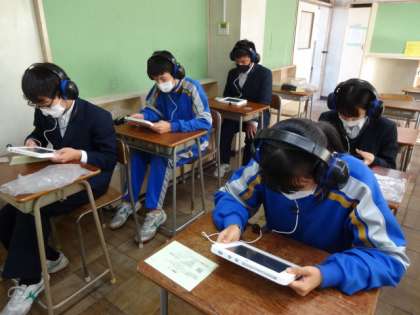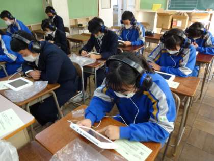 3年2組、英語。現1年生の都立高校入試で実施予定の「英語スピーキングテスト」。校内体験版プレテストを行いました。