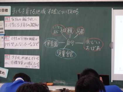 3年2組、家庭科。「子どもを育てる地域・社会について知る」