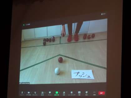 1年生のボッチャ体験授業です。密を避けるために、5時間目のクラスと6時間目のクラスに分けて行いました。講師は日本ボッチャ協会からオンラインです。6時間目の様子です。
