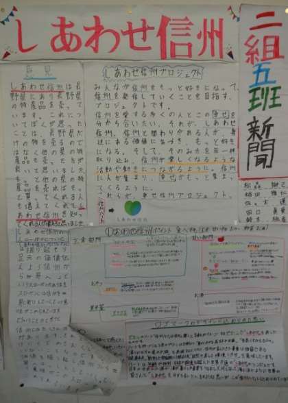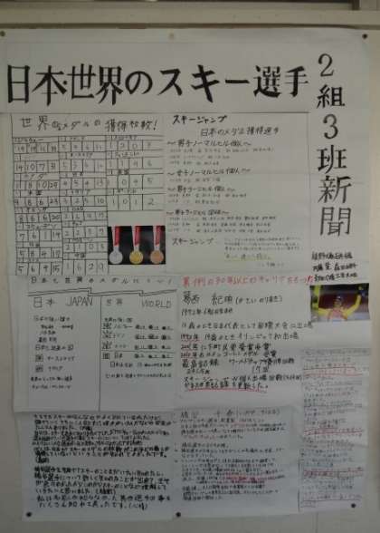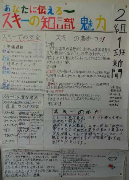 1年生が、移動教室の事前学習として、クラスの班ごとに壁新聞を作りました。廊下に掲示してあります。2組。