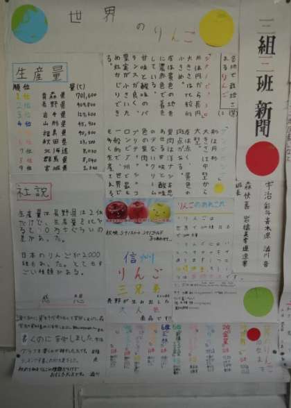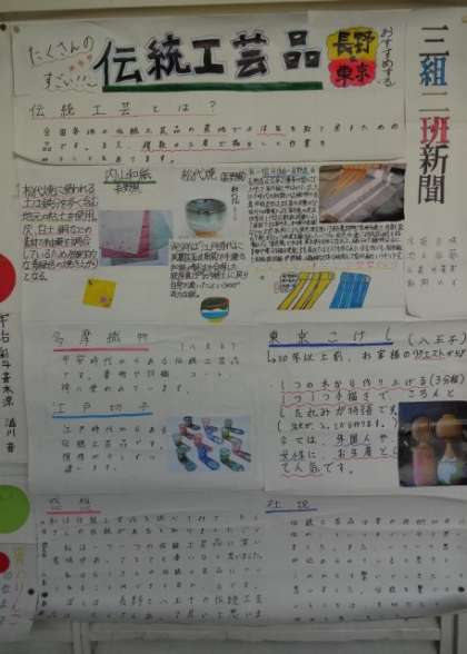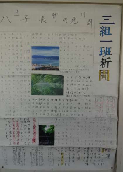 1年生が、移動教室の事前学習として、クラスの班ごとに壁新聞を作りました。廊下に掲示してあります。3組。