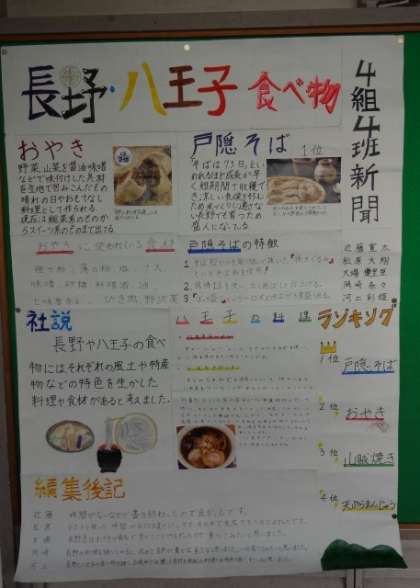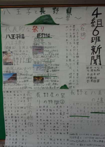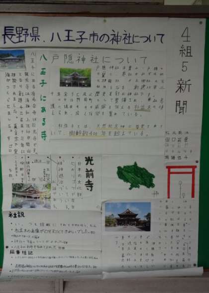 1年生が、移動教室の事前学習として、クラスの班ごとに壁新聞を作りました。廊下に掲示してあります。4組。