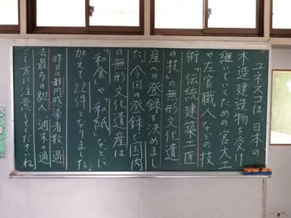 学年掲示板。今日も元気に(1年)、伝統建築工匠の技(2年)。
